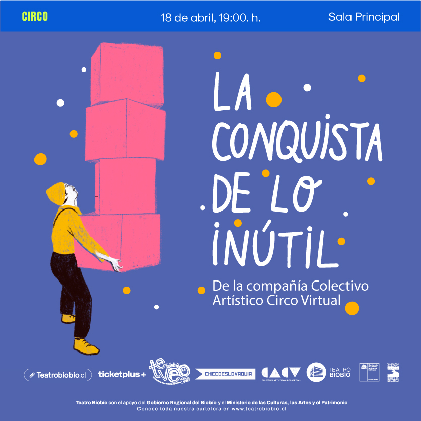 19.00 Horas. Función de la obra de circo contemporáneo familiar “La conquista de lo inútil”, de la compañía Colectivo Artístico Circo Virtual. Propuesta escénica en que el juego, las acrobacias y los movimientos se plantean como una exploración del paso del tiempo. Sala principal del Teatro Biobío. Entradas disponibles a través de Ticketplus.