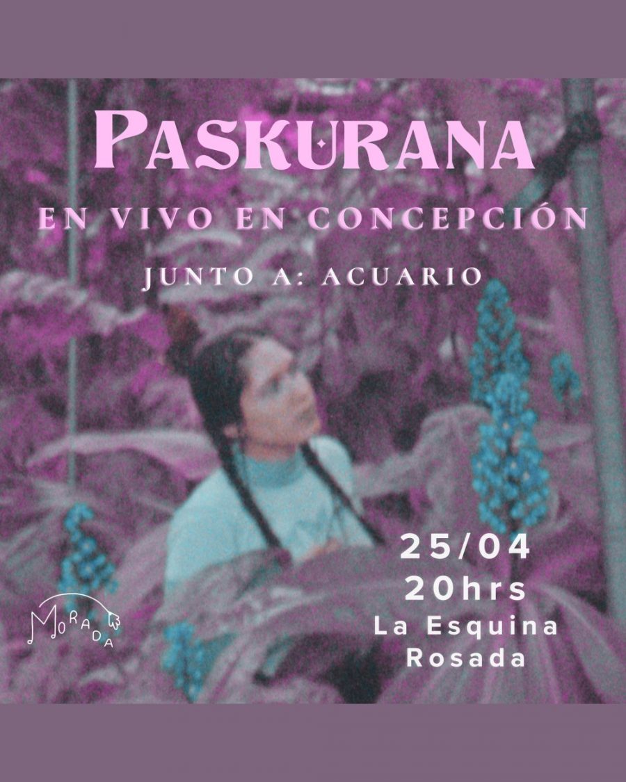 19.00 Horas. La artista Paskurana vuelve a Concepción para realizar un concierto de larga duración junto a su banda, incluyendo canciones de su LP debut “Parajes Oníricos”, así como también las nuevas composiciones que forman parte de su próximo disco. Artista invitada especial Acuario. Centro Cultural La Esquina Rosada (Vilumilla 899). Entradas vía Portaldisc.com.