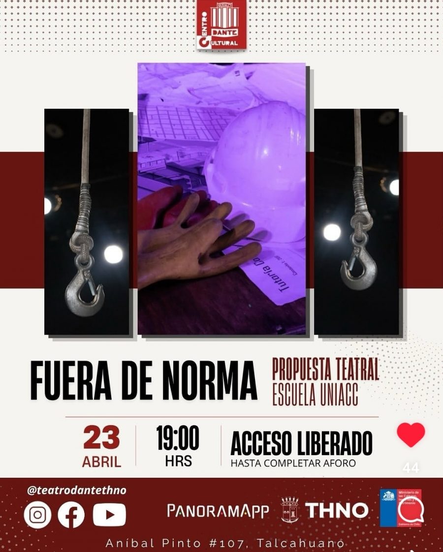 19.00 Horas. Función de “Fuera de norma”, propuesta teatral Escuela Uniacc. Centro Cultural Teatro Dante (Aníbal Pinto 107). Entrada liberada hasta completar aforo.