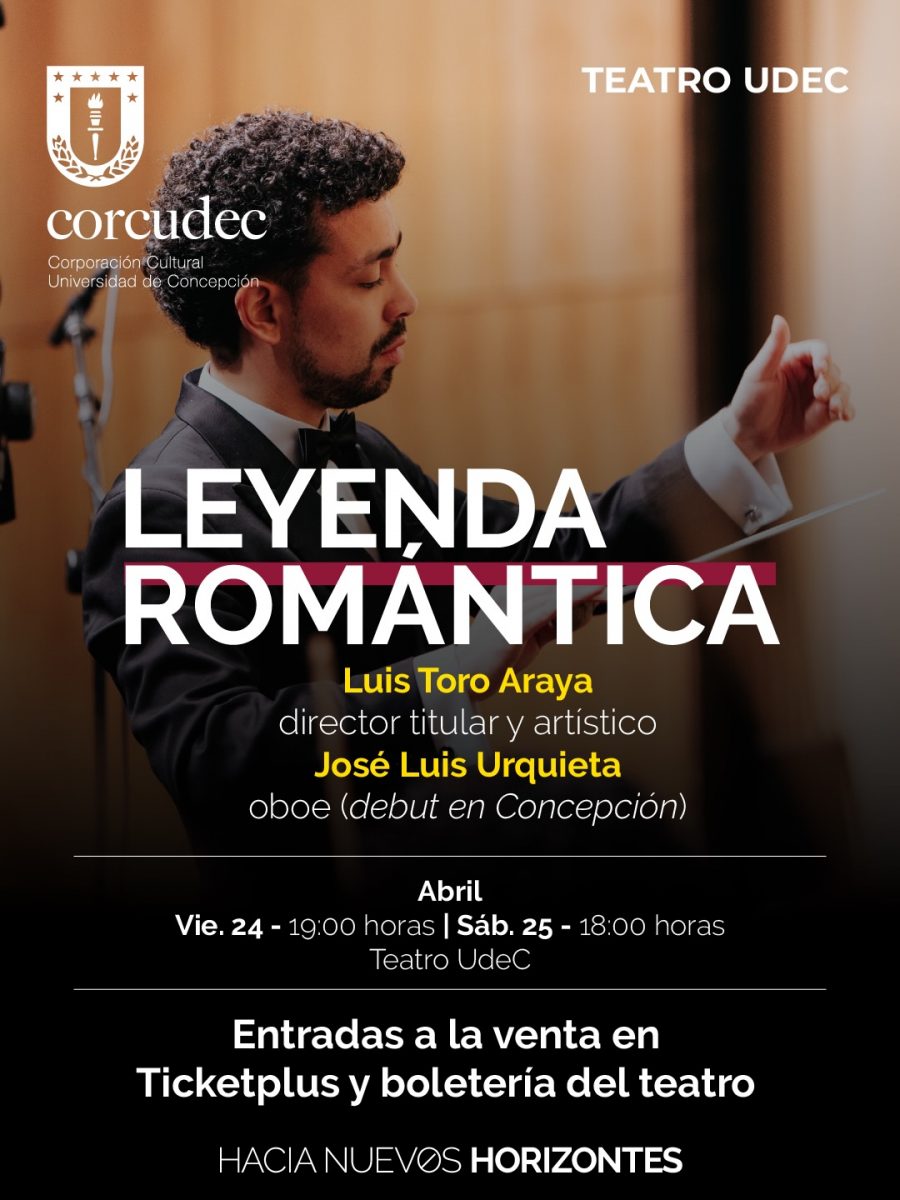 19.00 Horas. Concierto Sinfónico 3 “Leyenda Romántica”. Orquesta UdeC bajo la batuta del maestro Luis Toro Araya en que se interpretarán las obras Sinfonía N° 4 de Bruckner y “Oboe Manifesto III”, pieza en que participará como solista José Luis Urquieta (oboísta). Teatro UdeC. Entradas disponibles a través del sistema Ticketplus.