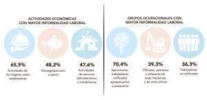 En relación a los grupos ocupacionales con mayor informalidad, se presentan con un 70,4% Agricultores, trabajadores calificados agropecuarios y pesqueros; con un 39,3% oficiales, operarios y artesanos de artes mecánicas y otros oficios. Finalmente, con un 36,3%, están los trabajadores no calificados.