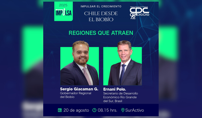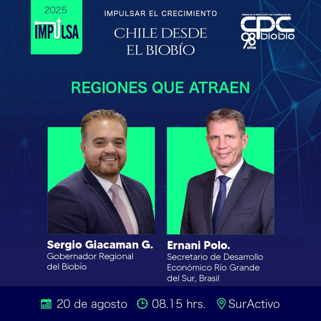 Una de las instancias claves de la nueva edición del evento empresarial Impulsa, organizado por la Cámara de la Producción y del Comercio, CPC Biobío, será el panel “Regiones que atraen” que protagonizarán el gobernador Regional, Sergio Giacaman, junto al secretario de Desarrollo Económico de Río Grande del Sur, Ernani Polo.