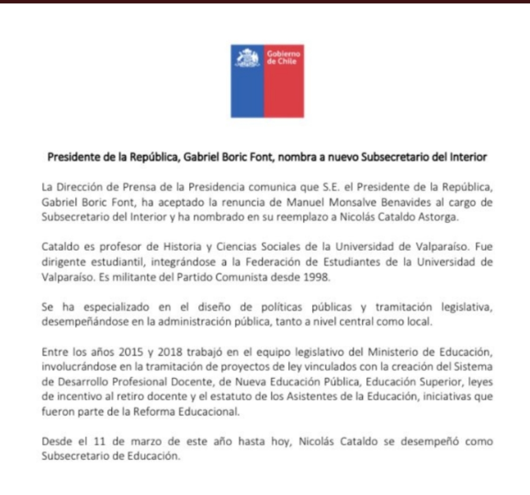 A través de un comunicado oficial, el Gobierno comunicó que Nicolás Cataldo (PC) reemplazará a Manuel Monsalve en la subsecretaría del Interior.