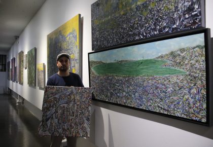 El artista oriundo de Arauco, por medio de 25 cuadros de diferentes dimensiones, apela el adentrarse en territorios y postales abstractas. Selección de obras que a su vez, son una buena muestra de la evolución de su propuesta pictórica y que abarcan un período de cerca de seis años. Montada hasta el 17 de mayo en sala de exposiciones de Artistas del Acero.