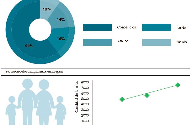 De acuerdo a los datos dados a conocer por la fundación, Talcahuano y Concepción son las ciudades con peores registros en la medición. Esto, porque la comuna puerto es la que tiene la mayor cantidad de campamentos (21), seguido por Lota (19); mientras que la capital regional es el lugar con más familias viviendo en este tipo de asentamientos, con casi 2.300. Lo mencionado anteriormente, convierte a la Provincia de Concepción en el territorio con mayor cantidad de campamentos de la región, con un 61% del total y detrás de ella se ubican las provincias de Ñuble y Arauco, con 16% y 14% respectivamente.