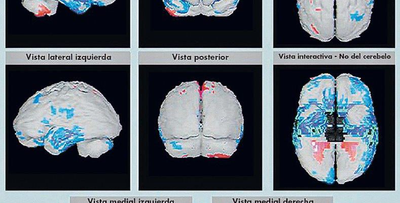 Efectos del consumo de marihuana en el cerebro . La áreas con función disminuida, según la tecnología NeuroSPECT, de un escolar consumidor de marihuana exclusivamente. Se observa en colores fríos (azul, verde) las áreas que se encuentran en hipofunción, es decir de dos a cuatro desviaciones estándar por debajo del funcionamiento normal, concentradas especialmente en el lóbulo temporal, de parecido modo en la corteza frontal.