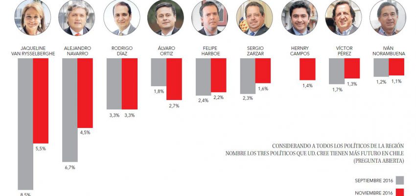 El mejor ejemplo de ello, es la tradicional pregunta relativa a los políticos de la Región con más futuro en Bío Bío, donde la mayoría de los consultados de forma espontánea, experimentan bajas en comparación al último estudio de septiembre.