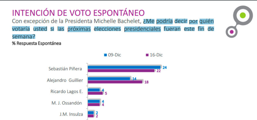 Mucho más abajo se encuenta el ex Presidente Ricardo Lagos quien subió de 4% a 5% y Manuel José Ossandón se mantuvo en el 4%. José Miguel Insulza, por su parte, se mantuvo en el 2% de las preferencias en la intención de voto.