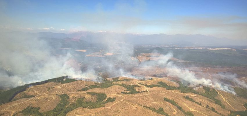 Mientras que en la Región del Biobío se encuentra más calmo, y se trabaja para su control. Se combate en el lugar con 3 brigadas Conaf, 2 brigadas del Ejército, bomberos y camiones aljibes. Afectando 600 hectáreas aproximadamente.